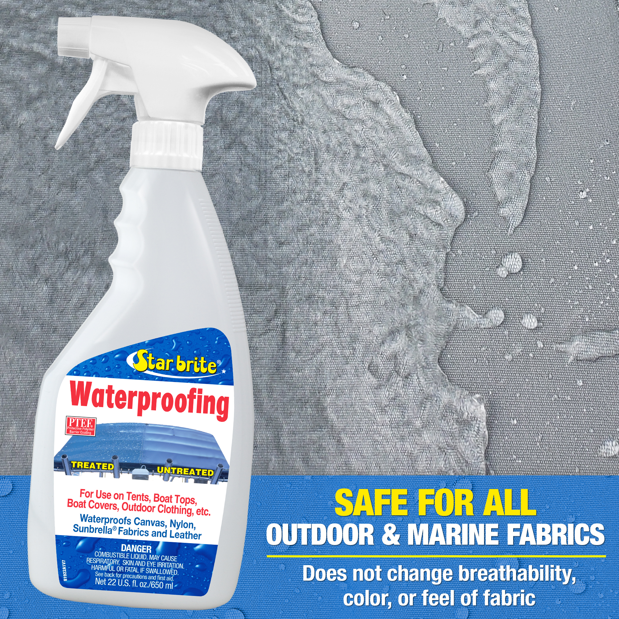 Το Starbrite Waterproofing σπρέυ αδιαβραχοποίησης αποκαθιστά την υδατοαπωθητικότητα σχεδόν σε όλα τα υφάσματα, από καλύμματα σκαφών έως τέντες bimini. Είναι επίσης ο ευκολότερος και αποτελεσματικότερος τρόπος για να αδιαβροχοποιήσετε καλύμματα αυτοκινήτων, σκηνές, μουσαμάδες, εξοπλισμό για άσχημες καιρικές συνθήκες, οροφές καμπριολέ και πολλά άλλα.