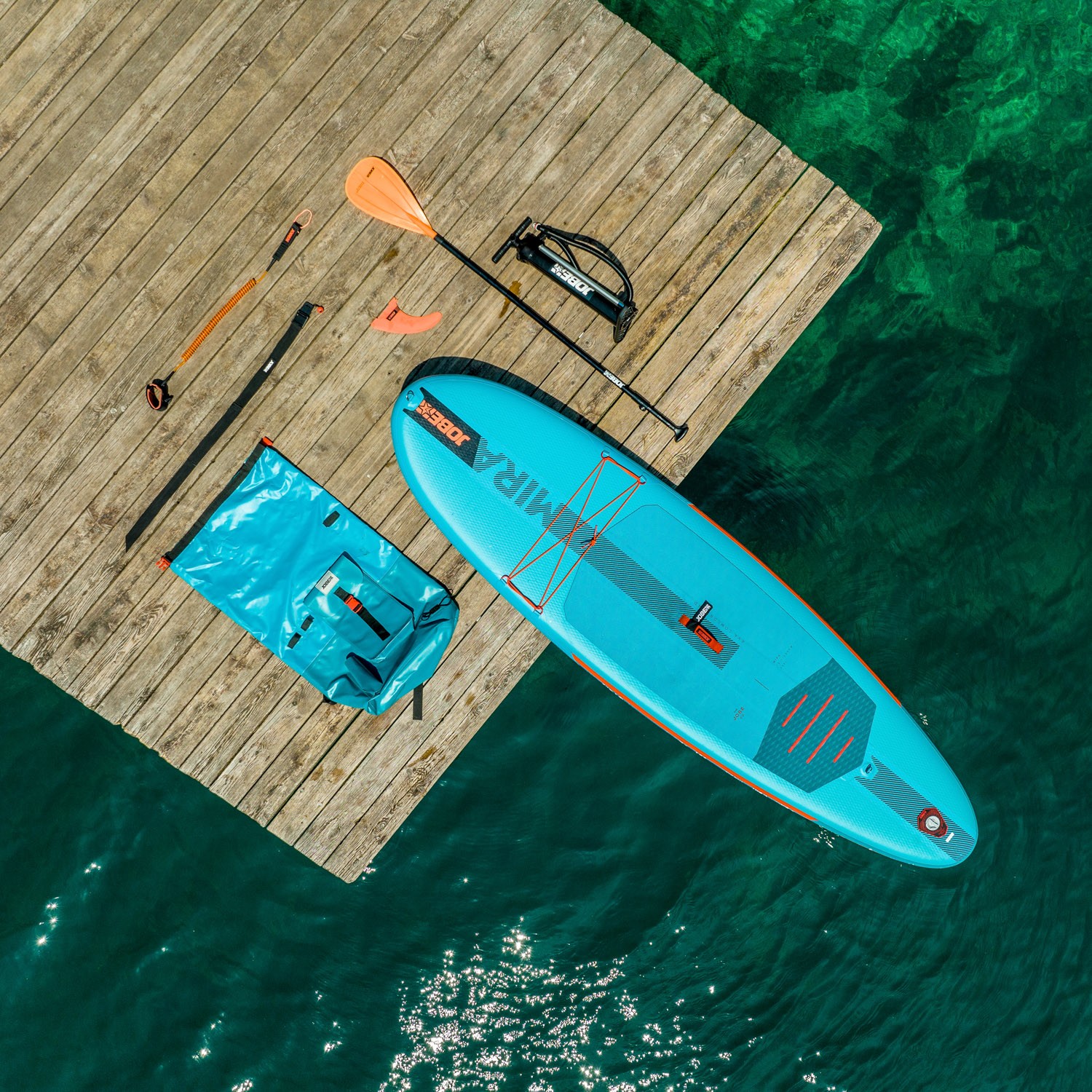 - Package contains: Aero Mira SUP Board 10.0, adjustable 3-piece aluminium paddle, waterproof backpack, double action pump, quick release waist belt, 10ft / 3,04m coiled leash