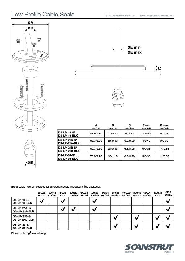 The unit is supplied with split, pre-drilled seals (to fit cable with 2-8mm and 9-14mm diameter), and a blank seal for self-drilling. The split seals mean that there is no need to remove pre-fitted connectors which can be up to 16mm and 30mm diameter and still pass through the housing.